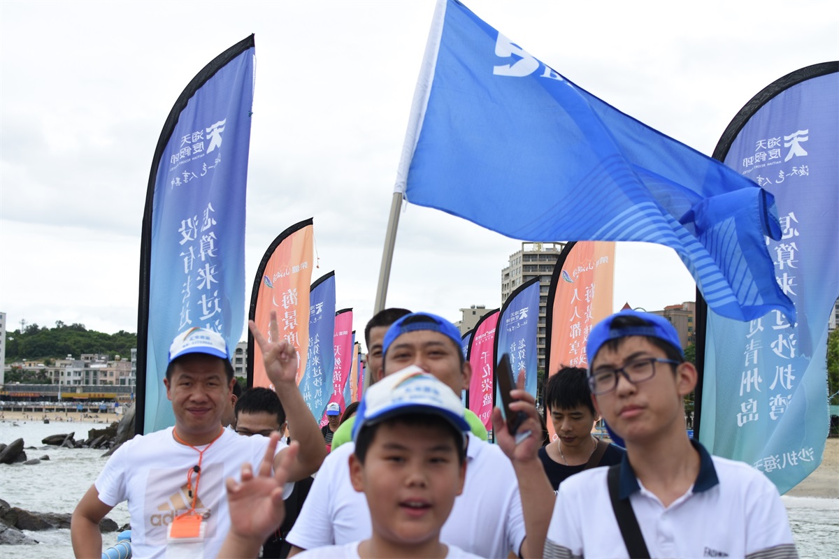 8月19號一大早,微風(fēng)拂面,大家都喜笑顏開,懷著無比激動興奮的心情踏上前往沙扒灣青州島的旅途。手中天藍(lán)色的旗幟,仿佛已感受到大伙兒的陽光與自信,也在空中翩翩起舞。